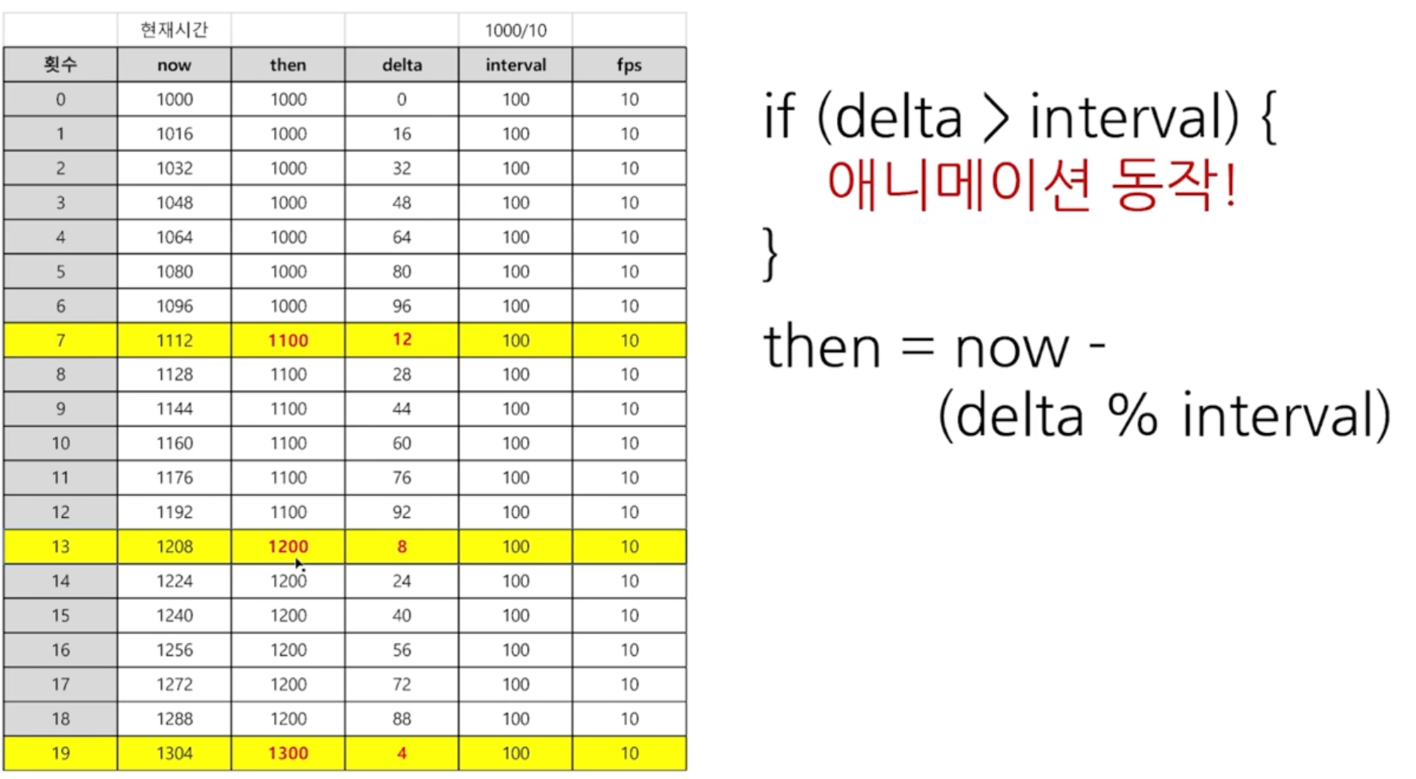 아래 표처럼 interval과 delta, date를 이용하여 fps 값을 구하고 해당 delta값이 interval 보다 클때마다 동작하도록 구현한다. 아래의 표를 보며 fps에 따라 화면에 그려주는 밀도를 확인해보자. requestAnimationFrame 메서드를 사용하는것을 참고