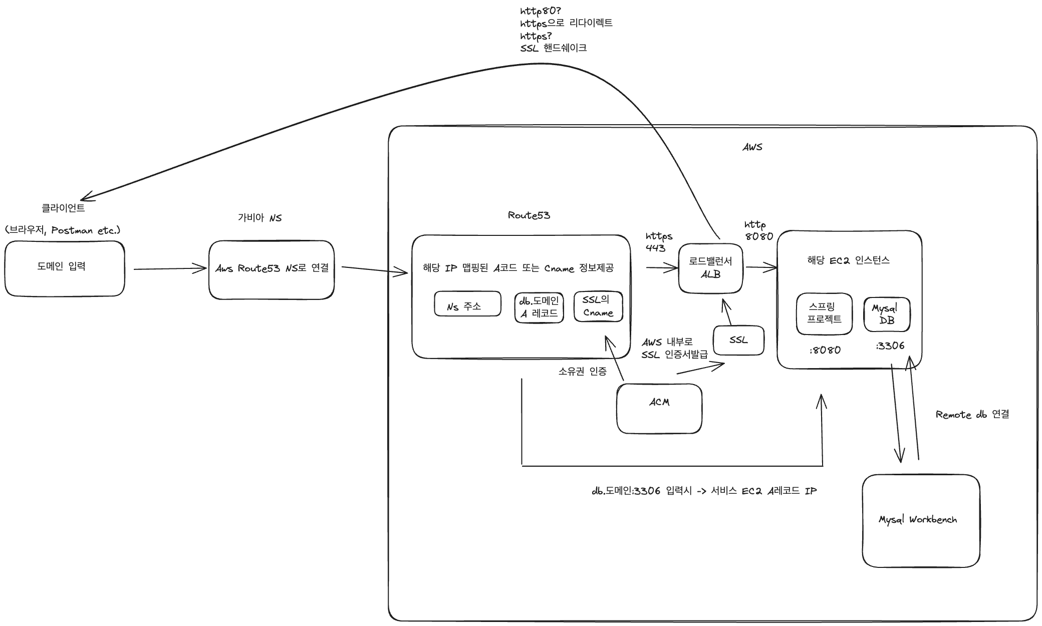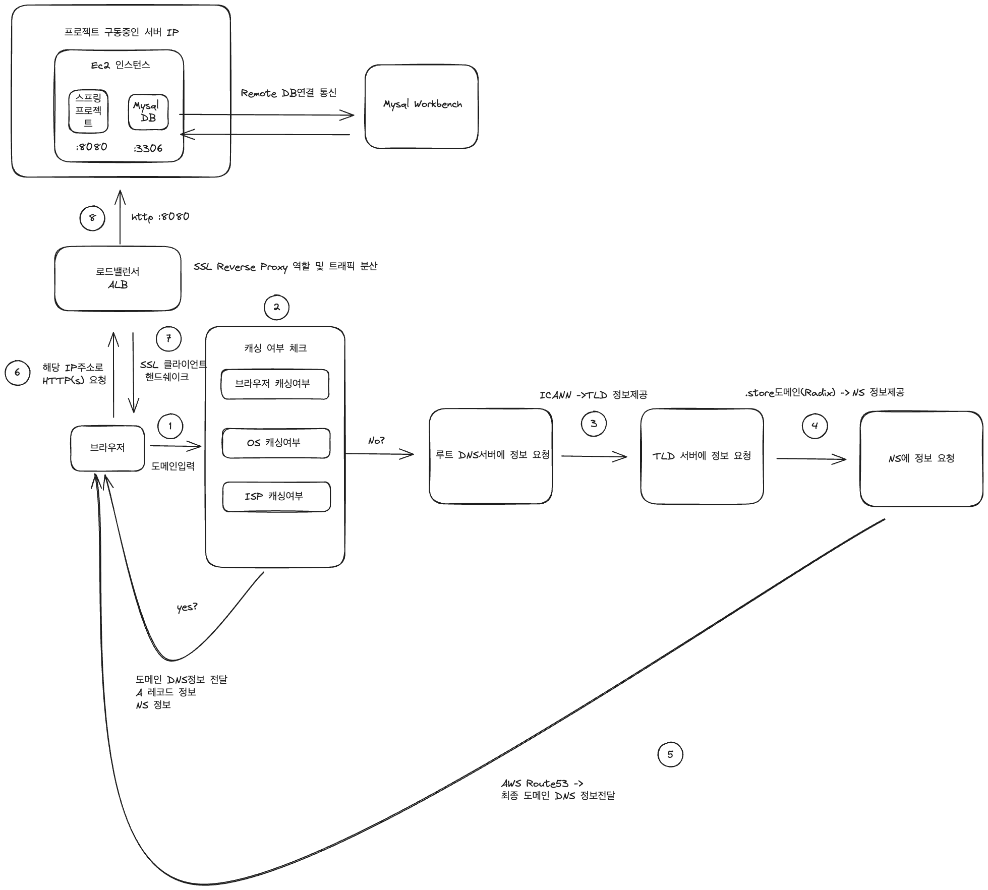 처음 이해했을 당시 그려진 그림 프로젝트 아키텍쳐 및 DNS 구조
