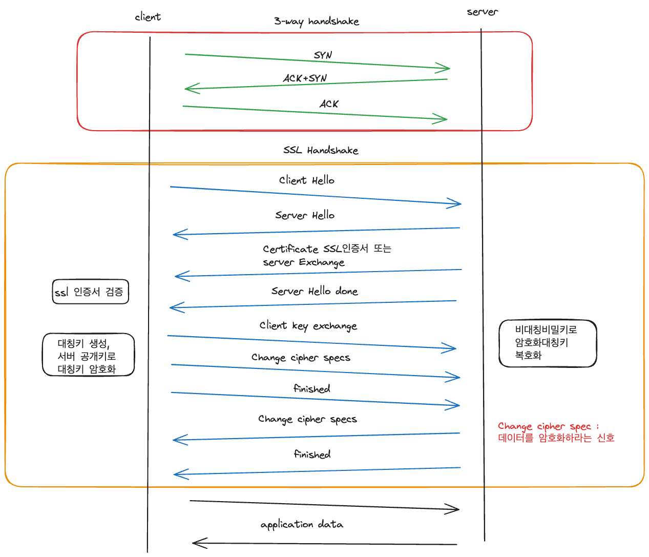 여기까지 설명을 하면 결국 SSL Handshake는 대칭키를 주고받기위한 행위, 그리고 그 대칭키가 어떤알고리즘을 쓸건지 정하는 공유가 주목적이되는거다. 그래서 데이터를 보내기전에 대칭키를 서로 공유하기위해서 서버가 제공한 비대칭키를 통해 클라이언트는 대칭키를 암호화해서 서버에게 보내주고 이를 서버가 비공개키로 해독하는 과정인것이다.