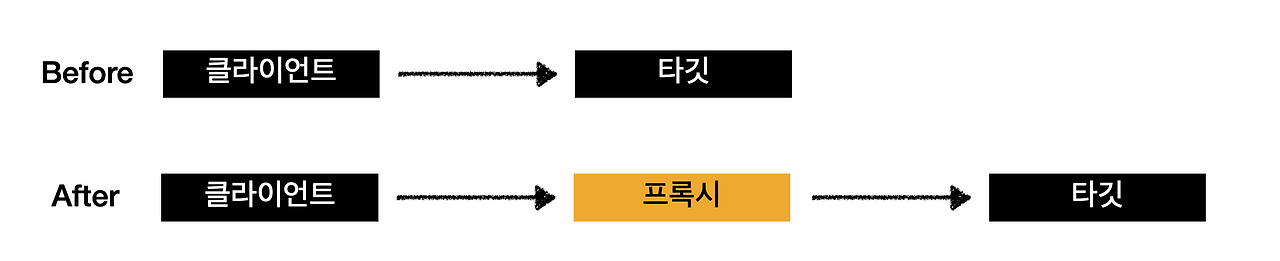 Proxy는 대리인, 대변인이라는 뜻으로 실제 대상(타깃)인것처럼 위장하여 요청에 대해서 대신 받아 수행하는 것이다.