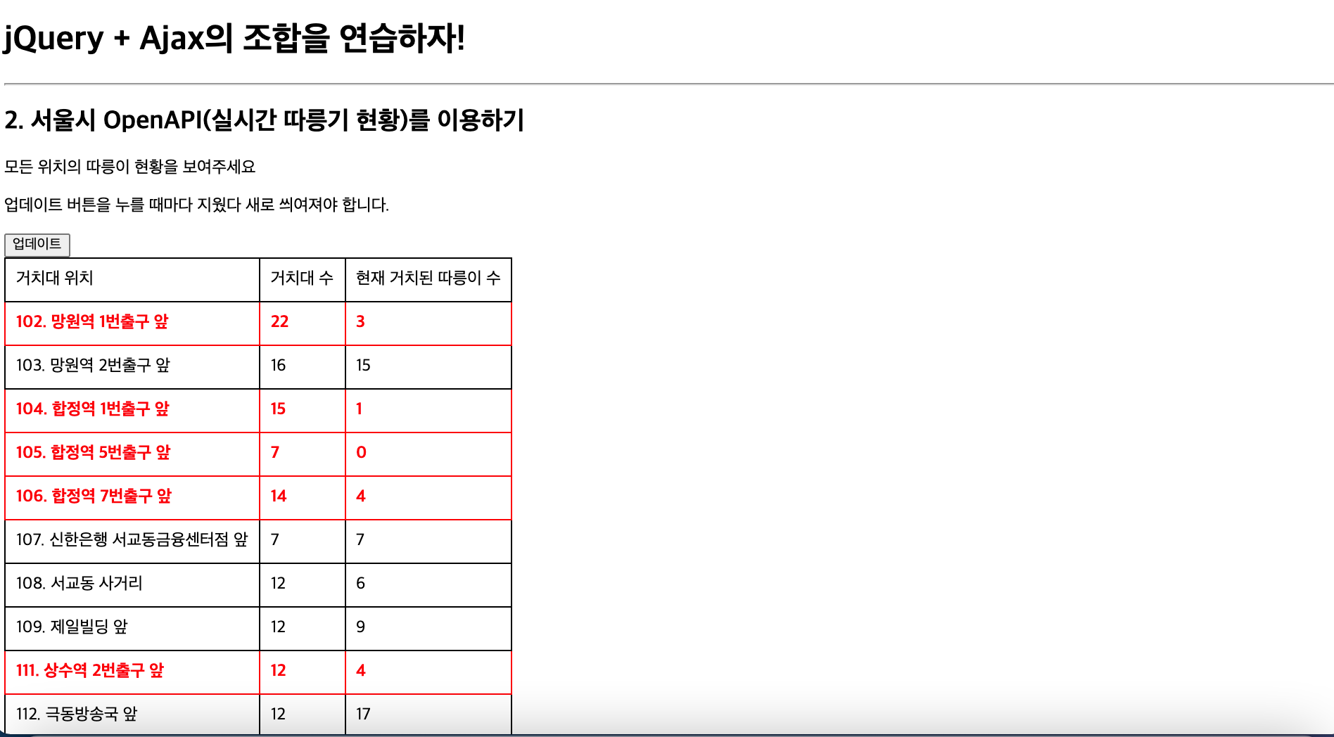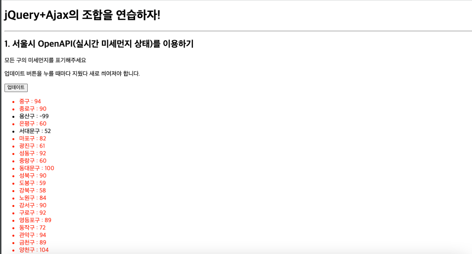 강의를 들으며 받은 openAPI url 주소를 $.ajax({ }) 에 씀으로써 실시간 동적? cdn 을 쓰게 한거같다. 미세먼지, 자전거 실시간 잔여석,