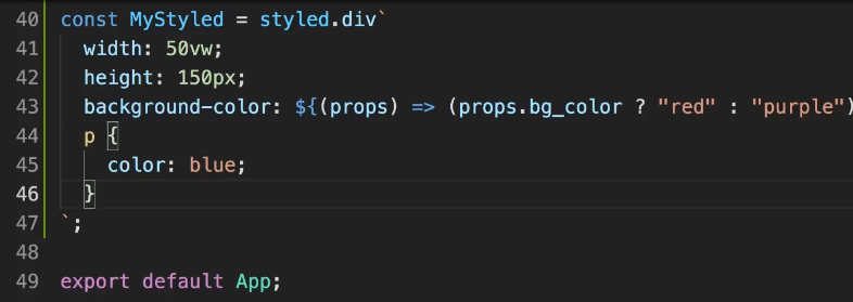 그리고 해당 변수태그안에 p라는 자식요소가 있다면 위의 styled 안 ``에서 그냥 css 쓰듯이 p{color : blue} 같은 형식으로 써주면된다.