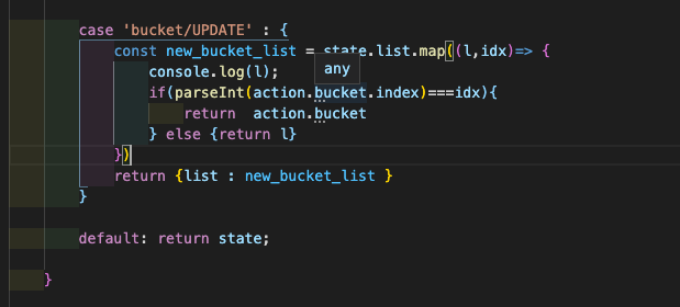 map 함수이므로 해당 인덱스안에 action.bucket 을 리턴해주므로 수정이 완료되는것이다 else 문을 써서 다른 경우는 기존에 있던 값 l ({name : , desc : , ex : }) 을 리턴하게 해주었다.