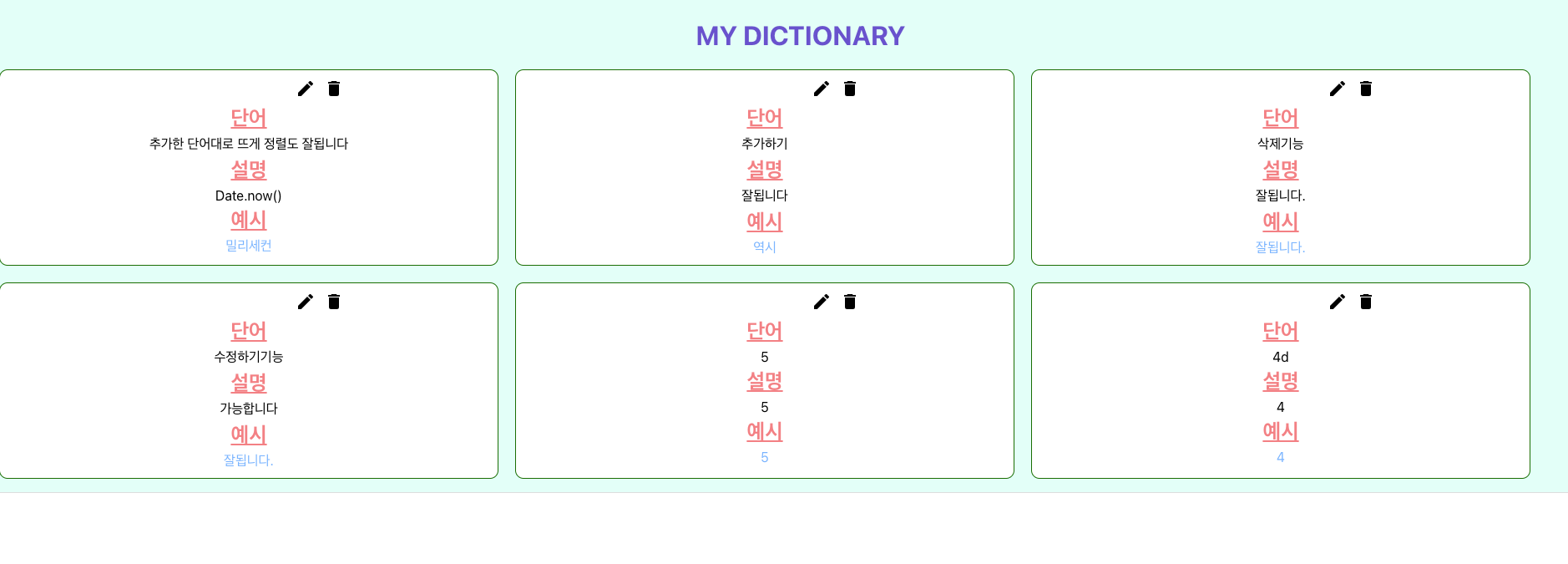 요번 4주차의 요구사항+ 추가기능까지 모두 완수하게되었다. 아쉬운건 메모장,단어장이기때문에 정답예시에 나온것처럼 다 외운건 체크박스를 해서 색을 변화하게 하는기능은 시간이없어서 하지못했다. 강의내용중에 프로그래스바를 애니메이션, transition 을 이용하였는데 실전에선 사용하지 못해서 나중에 기회가 된다면 쓸 생각이다. 내일은 팀과제 다같이 정리를하고 1강부터 5강까지 놓쳤던 부분을 다시 들을려고한다. State 부분과 Prop 부분을 다시 이해해야겠다고 생각했고, 자바스크립트 책도 보고 Css 도 좀 봐야겠다고 생각했다.