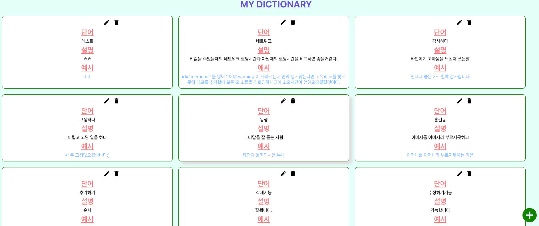요번주차때 막혔던 부분은 단어를 추가하면 리덕스에 쌓이는것과 파이어스토어에 쌓이는 리스트 배열정리가 다르게 이루워져서 다시 Load 했을때 웹브라우저화면에서 보여주는 순서가 바뀌어버렸다.