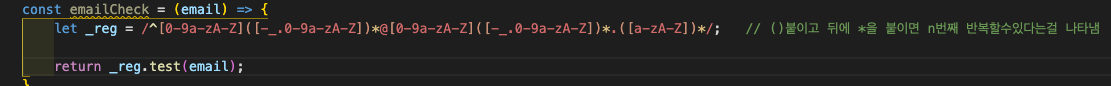 이렇게 만든 _reg 변수를 emailCheck 화살표함수에 넣고 return 부분에 매개변수로 받은 email 입력값을 .test()를 써서 확인을 한다.
