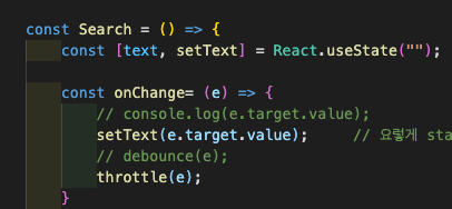 그런데 위에처럼 onChange안에서 state을 Set할경우 debounce가 원래대로 작동안하고 입력한대로 계속 출력해준다. 이유는 search 컴포넌트가 함수형 컴포넌트이기떄문이다. 리랜더링될때 변수들도 초기화되기때문에 설정한시간을카운트하지않고 throttle은바로 뽑아내거나, debounce는 이벤트가끝날때 똑같은값이 후두두두두 나온다.