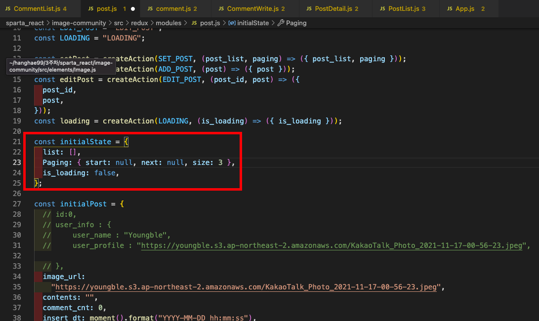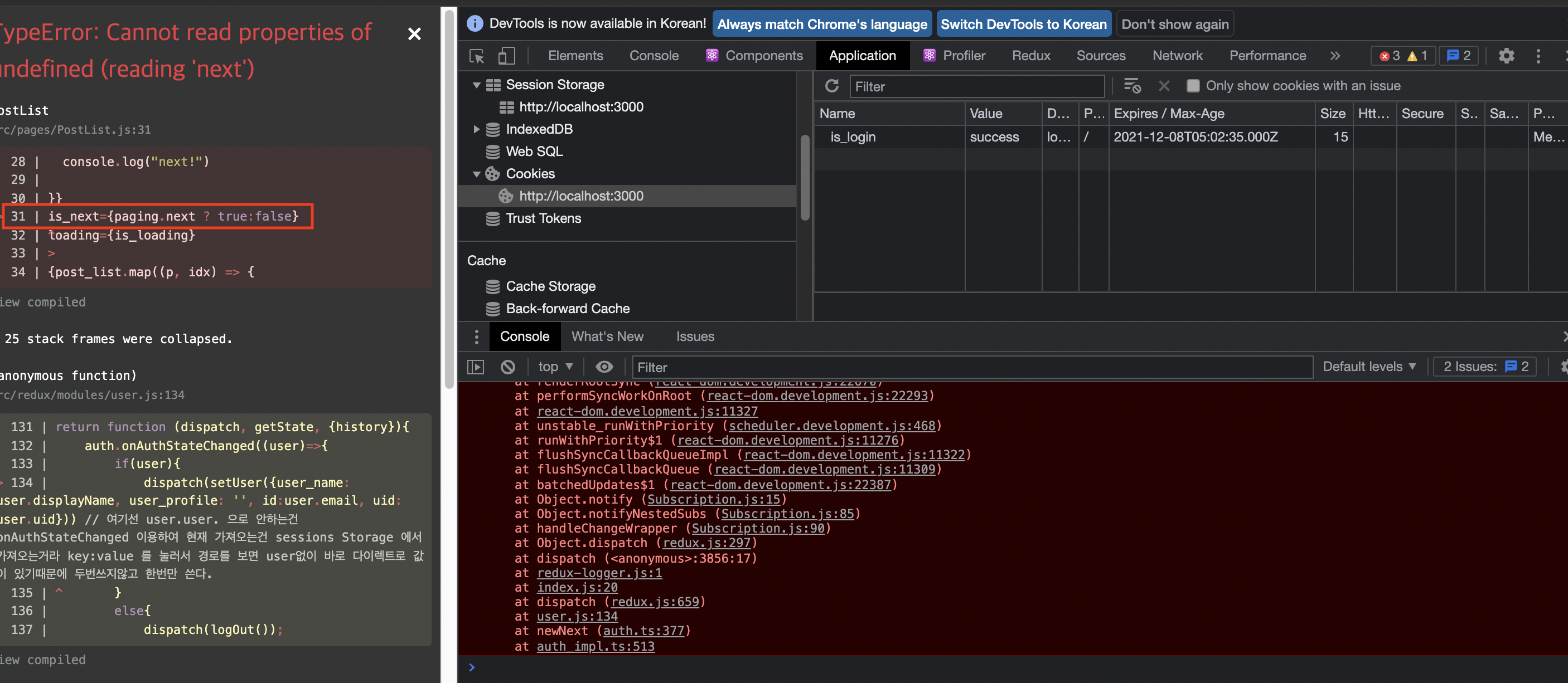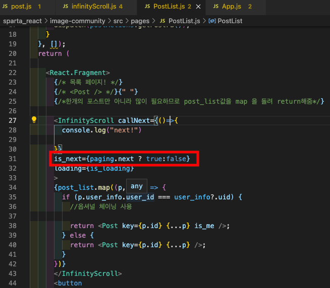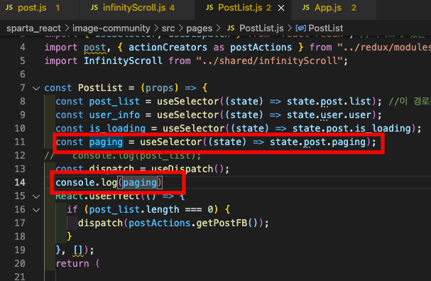 처음 스크린샷처럼 InifinityScroll 컴포넌트에 is_next 값을 {paging.next} 를 할당해주는데 할당후 실행하면 두번째 스크린샷처럼 type Error 뜨면서 paging.next 값이 undefined 라서 속성을 읽어올수 없다 라고 떠서 3번째 스크린샷처럼 useSelector 해서 post에서 paging 을 가져와서 paging 에 넣은것을 console.log 로 찍어봐서 값이 제대로 들어왔나 확인해 보았다. 그결과 4번째 스크린샷처럼 처음에 undefined 가 떴다가 그다음줄에 start ,next, size 값을 console창에 출력하는걸 보았다. 그래서 추측한게 자료를 읽어오기전에 is_next 속성값에 paging.next 를 넣어줘서 그런걸로 생각했는데, 강의에선 then 이나 무언가 비동기처리를위해 콜백함수를 써서 기다렸다가 하는거 없이 그냥 잘되는데 제가 할땐 undefined 였다가 값을 가져와서 어떤 식으로 값을 받아온후 읽어올수있을지 몰랐었다.
