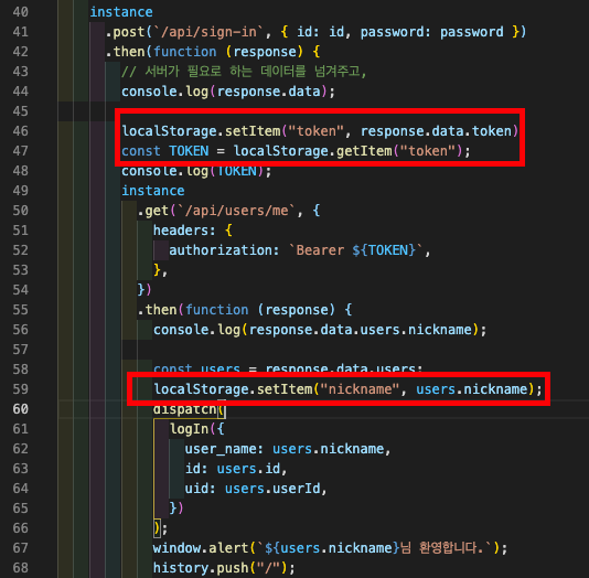 위와같이 module 부분 user에서 axios 로 로그인을 요청후 response로 받게되는 token 값을 localStorage.setItem을 이용하여 "token" 이라는 이름으로 그값을 넣고, 현재 유저정보도 axios 로 요청하여 response 얻게된걸 localStroage.setItem에 "nickname"이라는 변수로 닉네임을 넣어주었다.