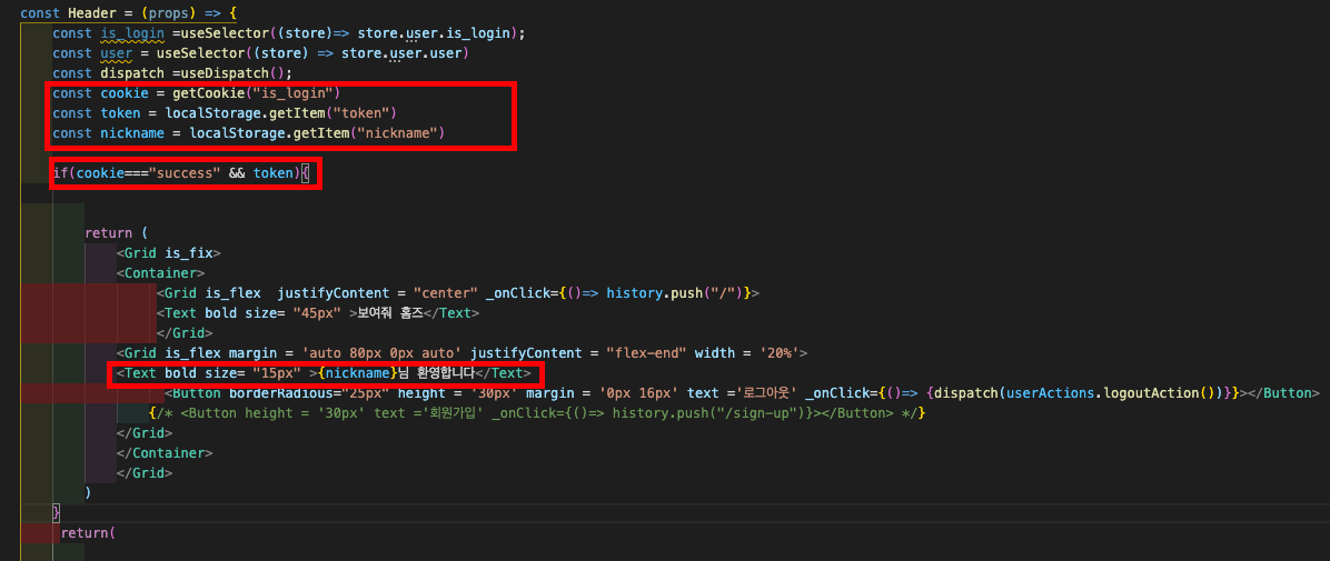위와같이 header 컴포넌트에서 getCookie로 is_login 쿠키를 불러오고, localStroage.getItem으로 token 과 nickname 을 불러온다.