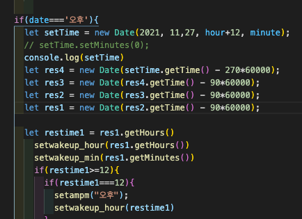 뒤에 -는 res4 부터 보면 60000millisecond(60초,1분)*270분= 4시간 30분 이다 이것의 1시간 30분 간격으로 더해주면 res3부터 6시간, 7시간반 ,마지막으로 9시간을 빼야하므로 res3의 60000(1분)*90(1시간30분) 더 뒤로 빼줌으로써 setTime에 설정한 시간의 9시간뒤로 간다.