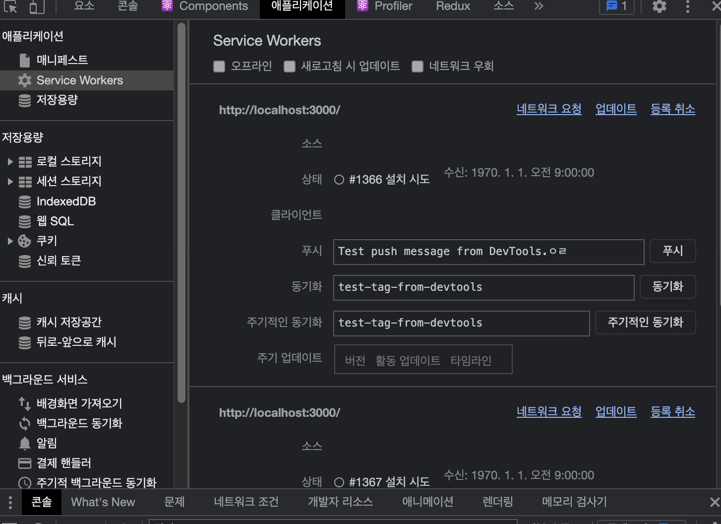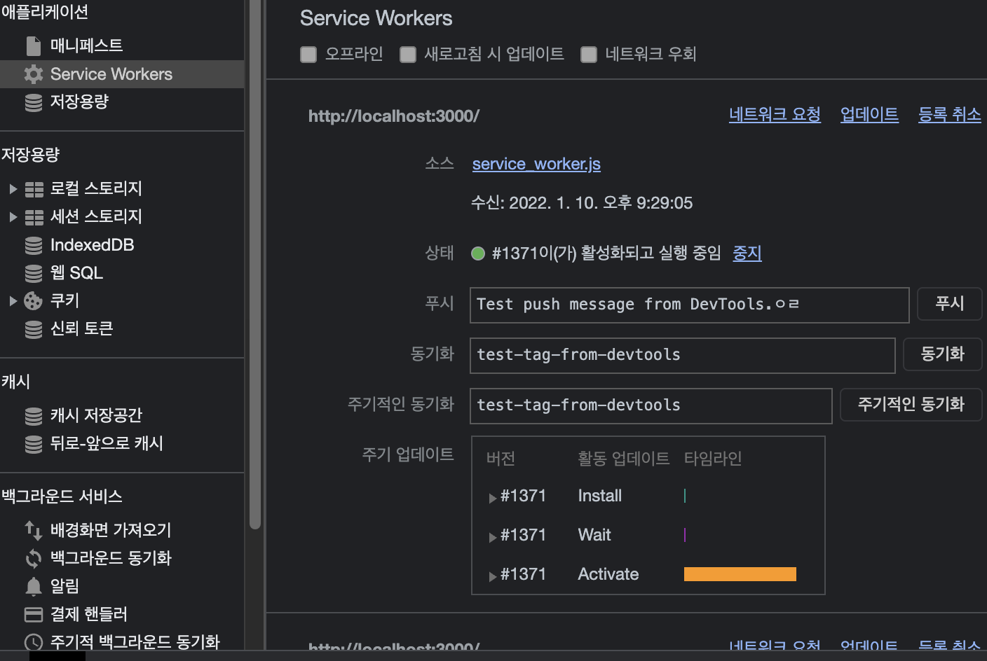 이제 서비스워커를 등록해주어야한다 위는 등록이 되지 않은 상태이기때문에 초록색으로 불이 들어온게 없다.