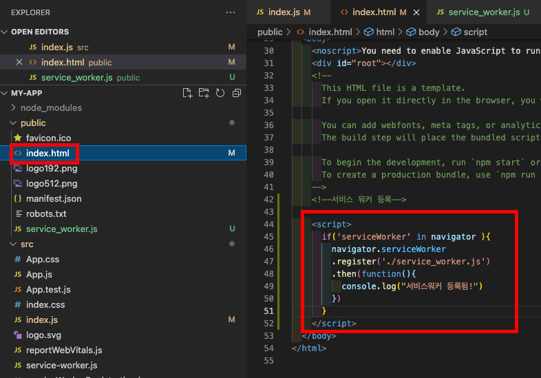 index.html 에서 register()을 사용하여 해당 위치에 있는 서비스워커 js파일을 등록해준다.