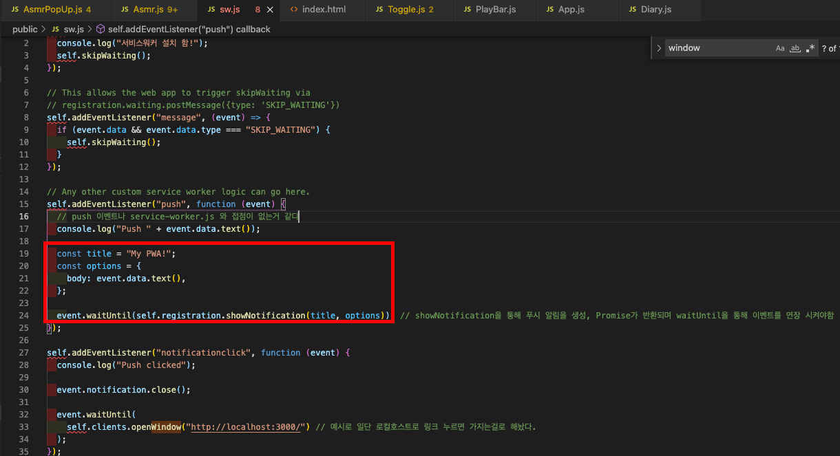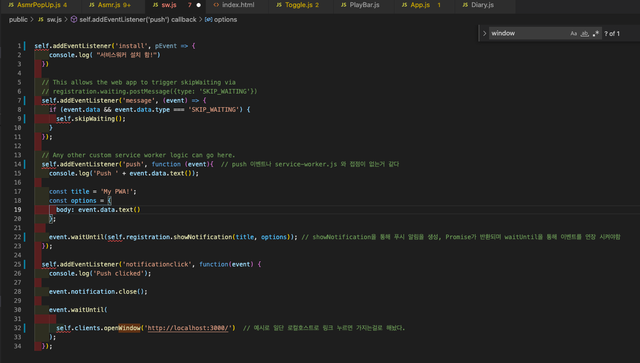 sw.js 에 모든 event를 넣었는데, 이때 self 가 빨간색으로 뜨지만 실행하거나 기능에는 문제가 없다. (window. 를 붙이면 빨간색이 없어지긴하지만 오히려 기능이 안되거나 window가 undefined 라는 에러가 콘솔창에 뜬다. 따라서 window. 없이 그냥 사용한다.)