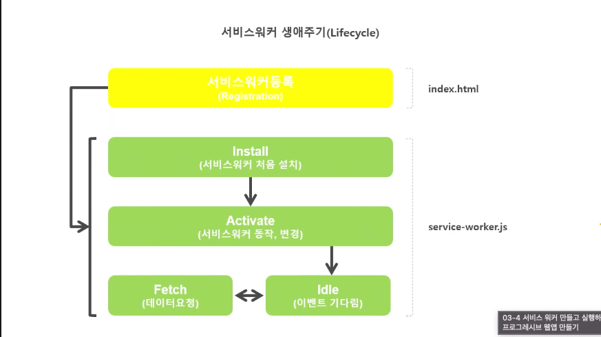 이때 중요한건 서비스워커의 생애주기가 어떻게 되는지 알아야 어떤순서로 적용되는지 알수있다.