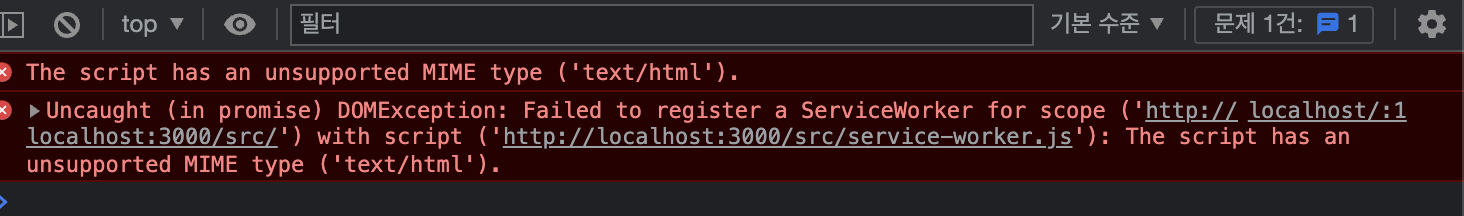 이렇게 해당 scope, src, src/service-worker.js 등록하는데 실패하였고 스크립트는 지원되지않는 MIME 타입을 가지고 있다고 한다.