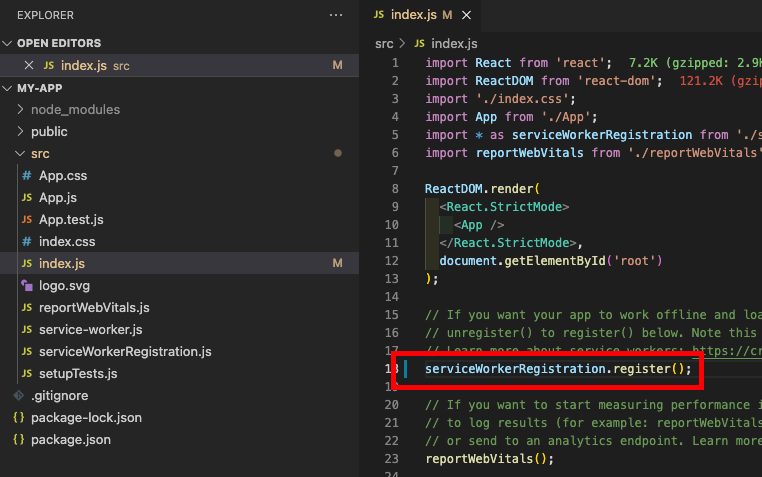 index.js 로 가서 serviceWokerRegistration.unregister() 부분을 register()로 바꾸라고 한다.