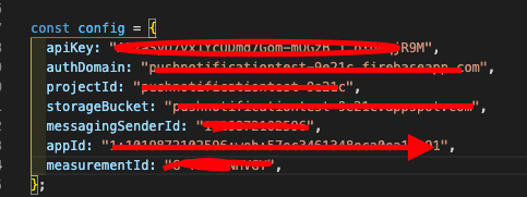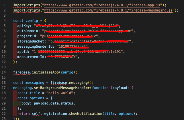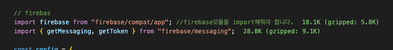 firebase에서 fcm프로젝트를 등록하면 주는 정보들을 등록하고, firebase.initializeApp(config)로 초기화해준다.