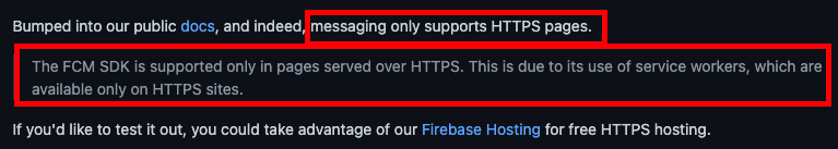 이제 남은건 localhost:3000에서가 아닌 http 와 https 에서 fcm 서비스를 이용 할수있는지 이다. 테스트를 위해 s3에 http로 배포를 하였고 firebase를 통해 https 로 배포를 하였다. 먼저 http 에서는 firebase 를 사용 할수없다고 에러가 뜨고, 구글링해본결과 http에서는 fcm을 사용 할수없다고 한다.
