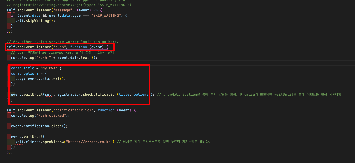 따라서 이것을 통한 event는 발생하지않는다. 이때 어떻게 해야 이벤트가 발생할수있을까 생각하다가 결국 서비스워커는 push, message 등 푸쉬알림기능의 event가 발생하면 반응 하기때문에 firebase함수를 쓰지않고 서비스워커 이벤트를 addEventListener를 사용하여 해당 푸쉬알림에 받을 정보들을 넣어주었다.