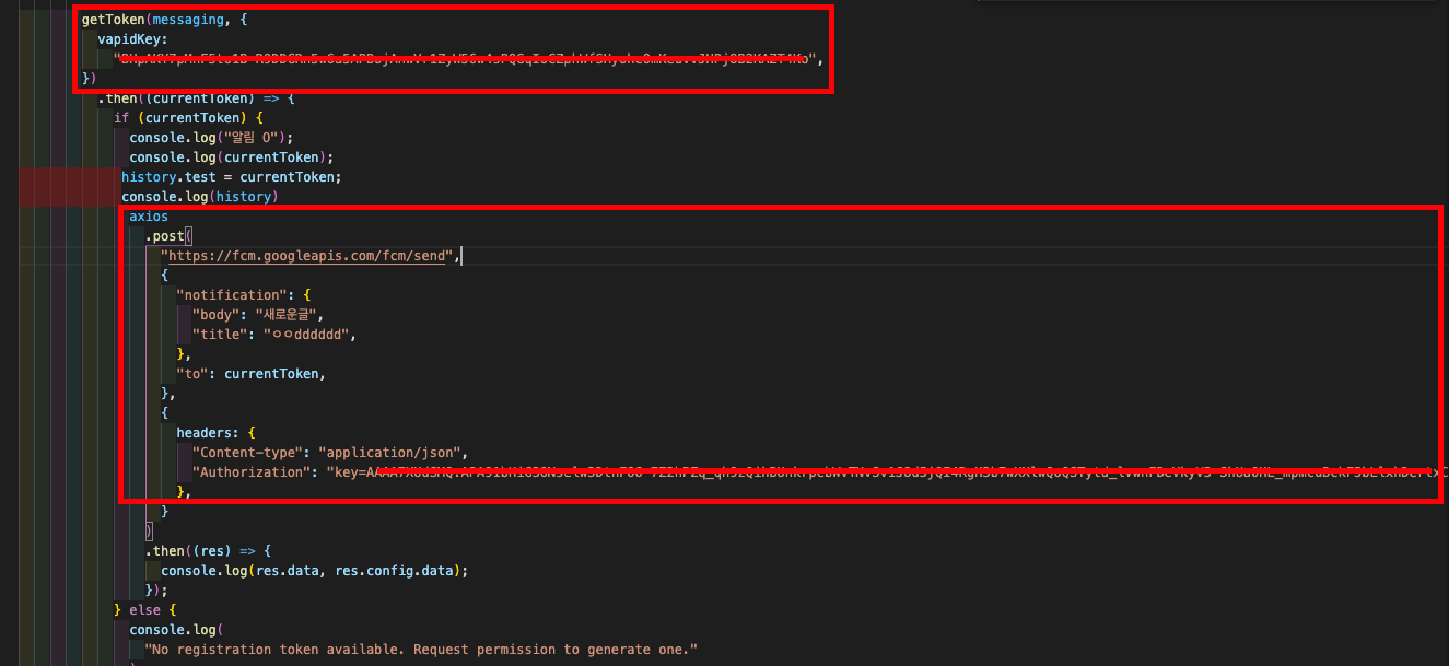해당 사용자가 토큰을 가지기위해 getToken()을 사용하게하여 해당 이용하려는 서비스정보와 vapidKey를 넣어준다. 그럼 token을 반환해주고 그것을 fcm/send 주소로 json형식으로 줘야할 data들을 보내준다. 이때 headers의 authorization에 "key=서버키"를 넣어준다.