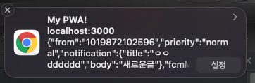이렇게 하면 push 이벤트가 생길때 event에 그 정보가 담겨져 오는데 그것을 event.data.text에 있는데 그것을 넣어주고 showNotification을 사용하여 보여주기로했다. 그결과 다음과 같이 뜬다.