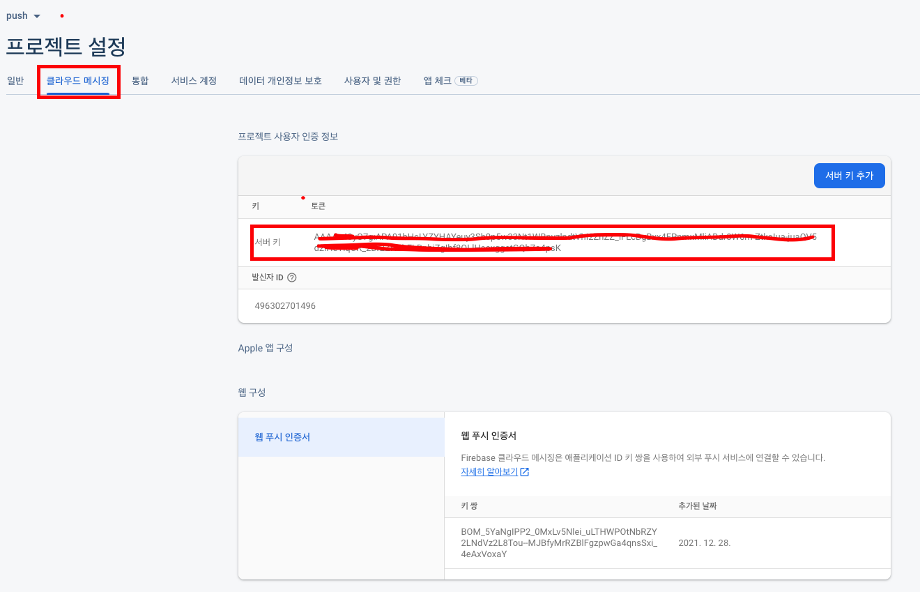 서버 키는 프로젝트 개요 옆 톱니바퀴를 클릭하고 클라우드 메세징 탭에서 서버 키를 복사하여 넣어주면된다. 이렇게 잘 보내주면