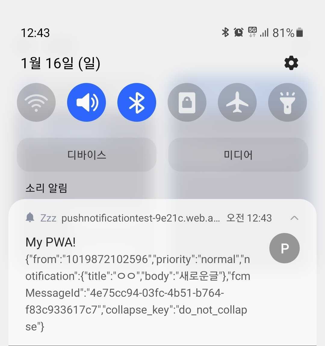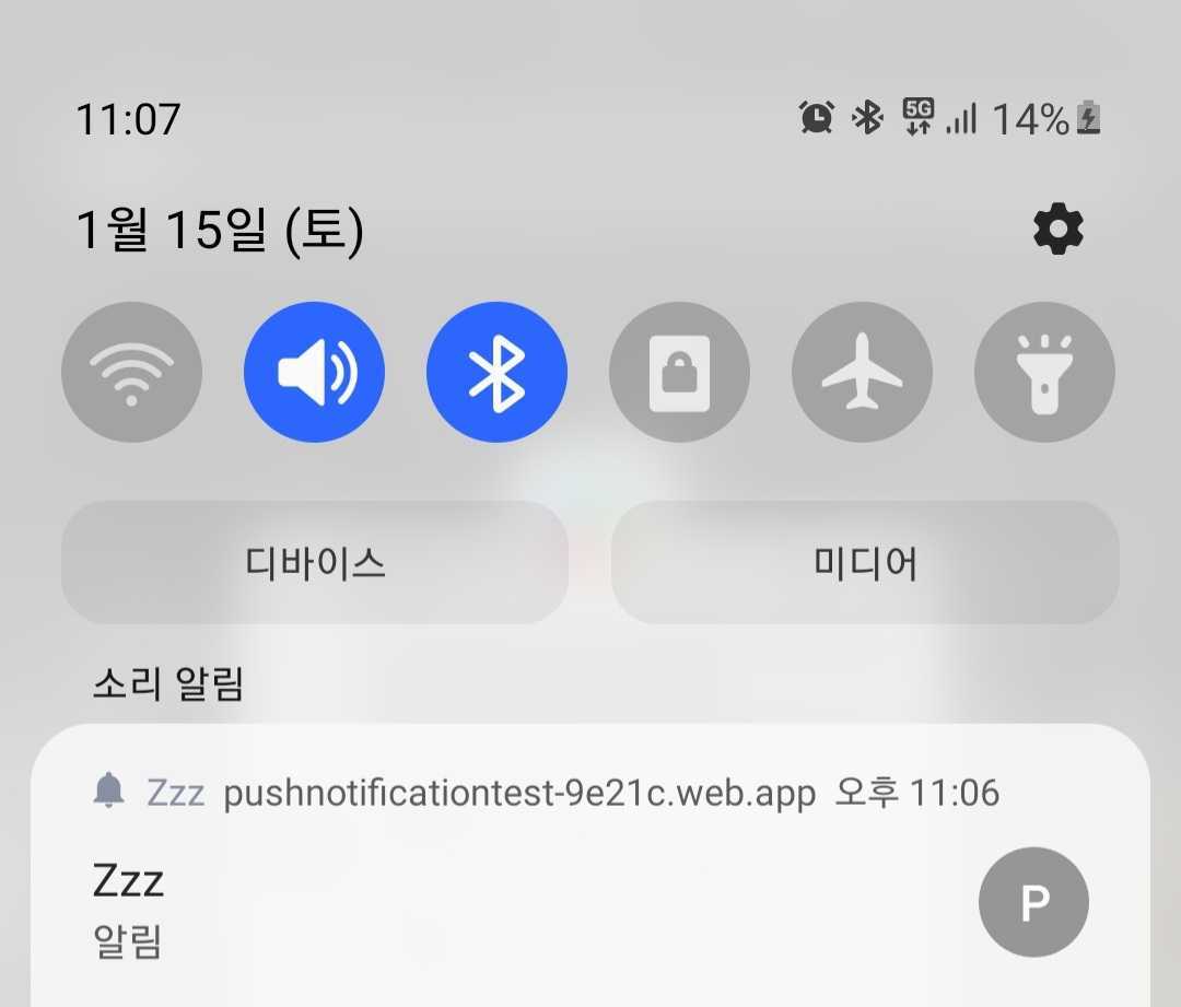 따라서 firebase에 배포한 https를 이용하여 실험한 결과 잘되는걸 볼수있었고 이제 웹에선 확인을 하였으니 모바일에서도 푸쉬알림이 오는지 확인하였다. 결과는 성공적이다.(이때 안드로이드로 실험하였다. ios 경우 권한허용 창이 뜨지않는다. 나중에 테스트하기로했다.)