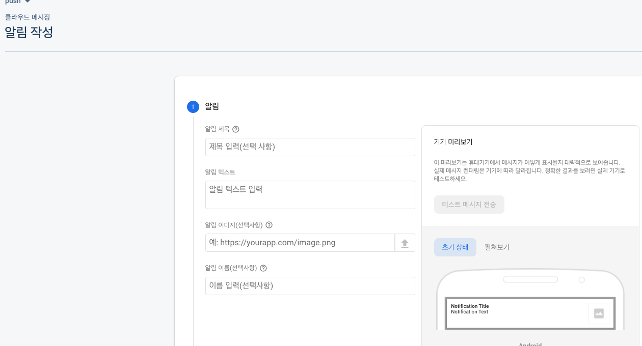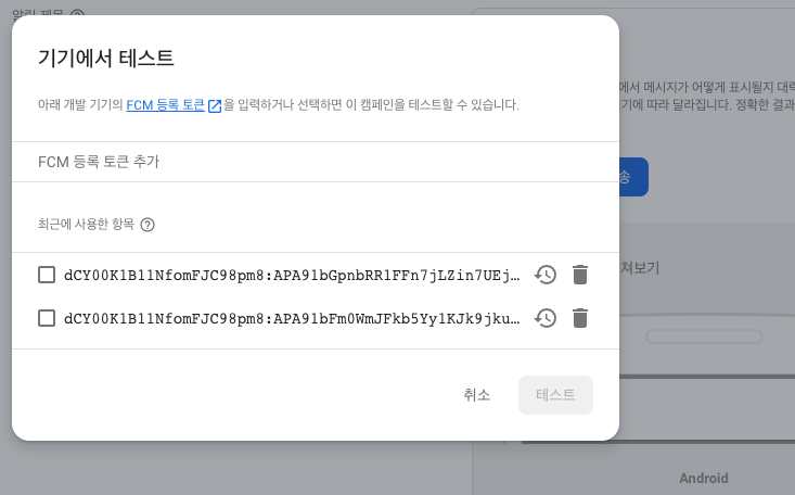 이때 api를 통해 해당 메세지를 보내주는것이아니라 사이트에서 직접 되는지 확인하기 위해서는 아래와 같이 messaging 에 있는 클라우드 메시징 알림 작성을 하여 기기 테스트 메시지 전송을 눌러 토큰을 넣어준다