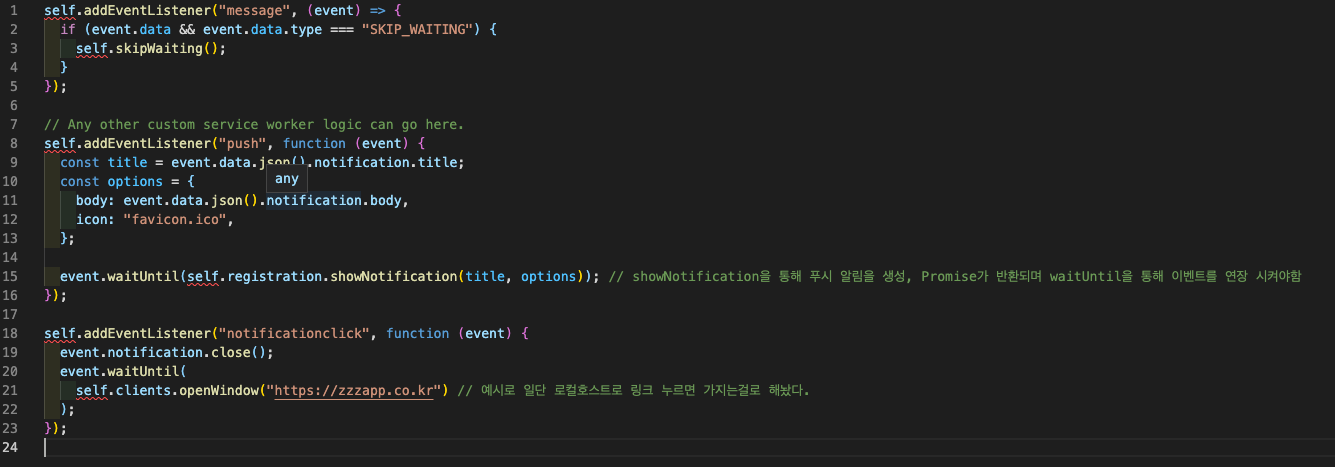 그리고 그안에서는 각각의 서비스워커 이벤트가 발생할때 실행되는 함수를 입력해놓았다. 우리가 일단 필수적으로 쓰고있는건 push 와 notificationlick 부분이다.