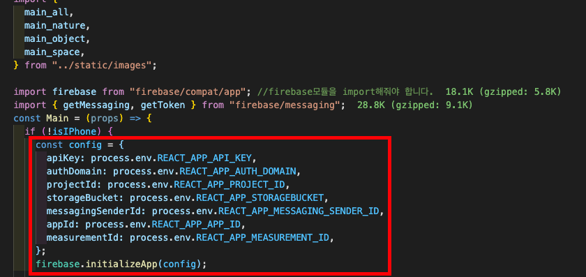 이렇게 설정을 마추게 되면 메인화면에서 firebse 초기화부분 아래에 다음과 같이 작성했다.