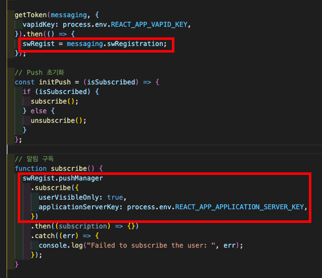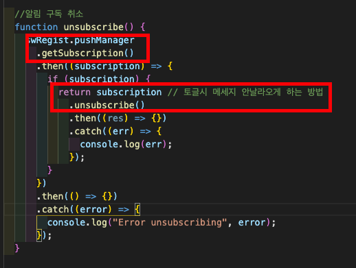 구독과 구독취소를 위해선 그에 해당하는 함수가 필요한데 만약 getToken을 통해 토큰을 받아오게된다면 firebase를 초기화 했기때문에 서비스워커가 등록되어있다 그래서 messaging.swRegistration 로 접근하면 pushManager를 쓸수 있는데 일단 너무 길기 때문에 위의 사진처럼 swRegist 라는 전역 변수에 담아두었고, 두번째 빨간박스처럼 swRegist에서 pushMagager에 접근하고 그안에 subsribe()함수를 이용하여 on 일때는 해당 푸쉬알림을 구독하게 했다.