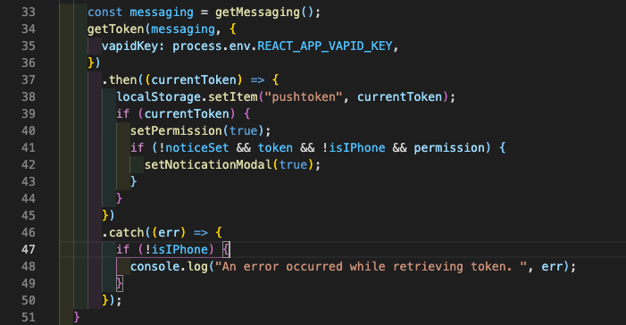 이는 fcm 을 이용하기위해선 firebase cloude service에 등록된 정보들을 getToken 1번째 인자에 넣어주고 그 fcm 이용하는 고유의 vapideKey(public key) 를 2번째 인자에 객체 형식으로 넣어주었다. 그렇게 하면 각 유저에게 고유의 token 값을 가지게 되는데 어느 위치에서건 새로고침해도 필요하기때문에 localstorage에 담아두었다.