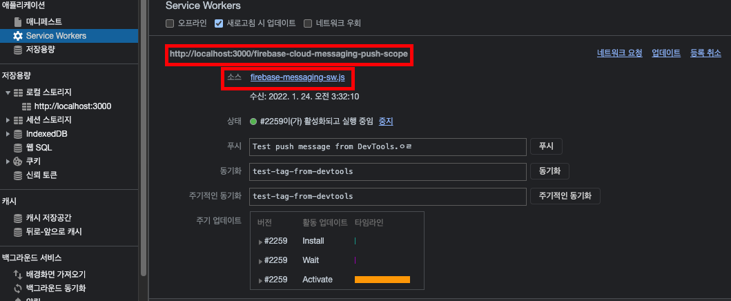 먼저 메인화면에서 fcm 정보를 가지고 초기화를 해주는 코드를 썼다. 이렇게 하면 자동으로 fcm의 서비스워커 또한 생기게 되는데 아래스크샷을 참고하면
