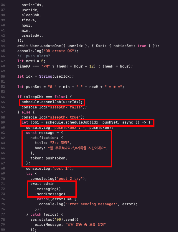 위와 같이 백엔드 node.js 서버에서 받아온 token을 가지고 보내줄 메세지를 message 변수에 객체로 담아주고, 서버쪽에서 사용할 firebase sdk를 설치하여 admin.messaging().send()를 통해 보내주고 싶은 내용을 요청한다. 이때 서버는 해당 유저가 설정한 시간에 푸시알림을 줘야하기때문에 schedule 라이브러리를 사용하여 시간을 기억하고 그 시간에 마춰서 보내주게 하였다.