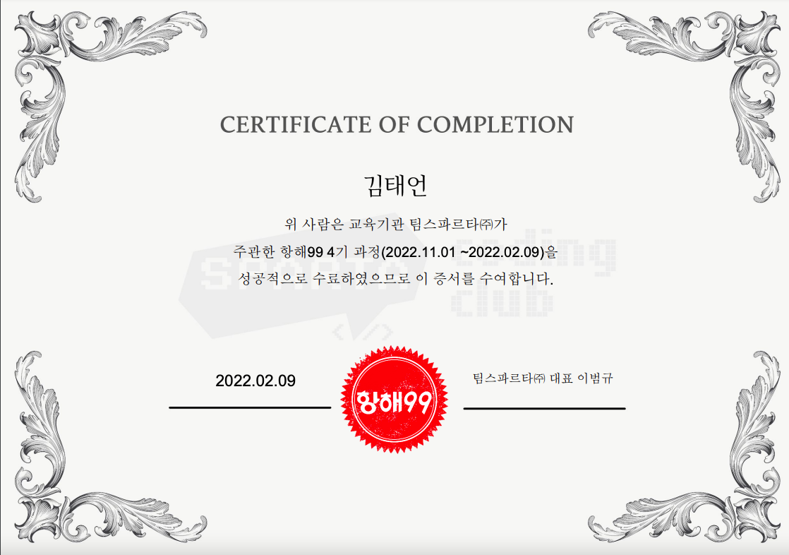 드디어 99일이란 시간이 지나고(설날로인해 101일까지 진행하긴했다) 2022.02.09 항해99 4기로 수료를 하였다.