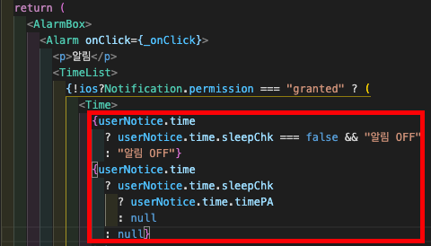 이를 방지하기위해 위의 코드처럼 userNotice.time 이 있는지 없는지를 체크하여 있다면 sleepChk에 접근을 하고 없다면 "알림 OFF" 라는 임시적인 데이터를 사용하여 렌더링 처리하도록 한것이였다.
