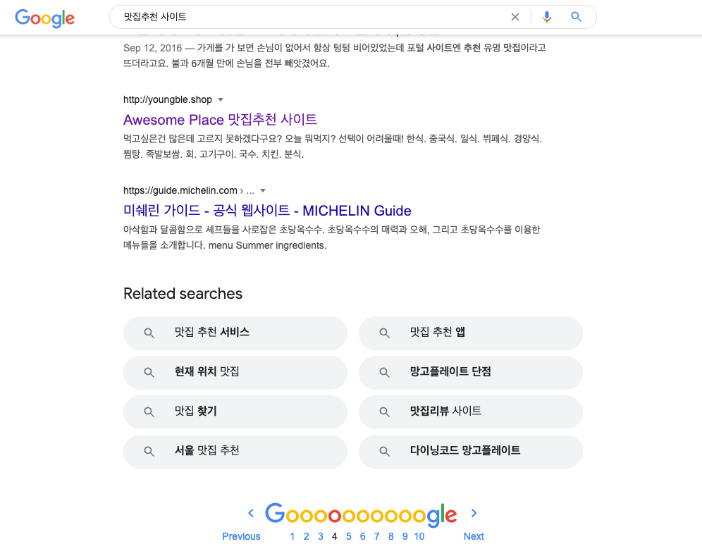 아래와같이 만약 맛집추천 사이트 라고 검색시 페이지 4번째줄에 뜨는걸 확인했다. 내생각엔 일단 https 로 하면 구글에서 가산점을 준다는게 이부분이지 않을까 싶다 나는 http 로만 했기때문에 아마 https 로 변경시 좀더 우선순위로 뜨지 않을까 싶다.
