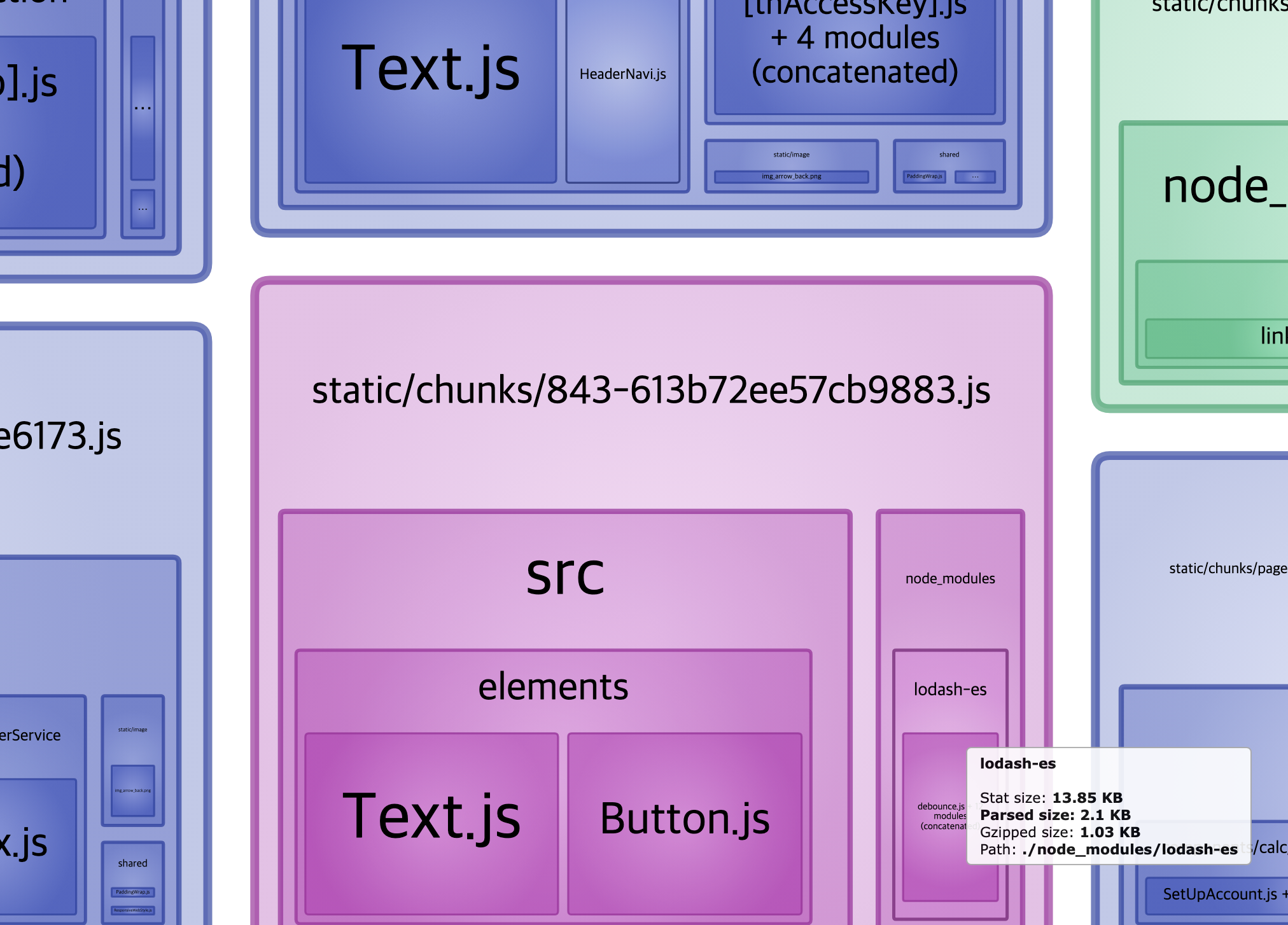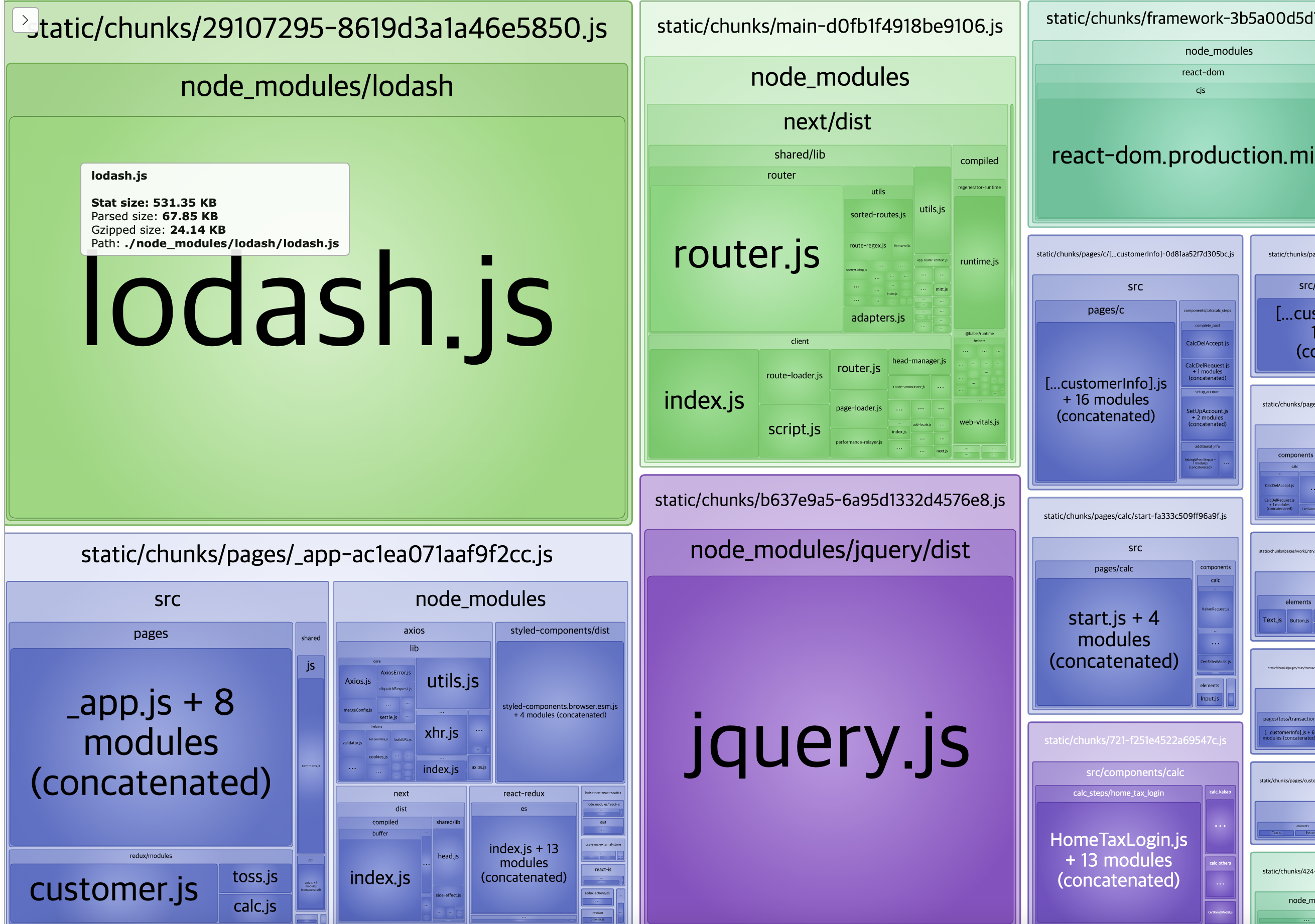 위의 사진은 @next/bundle-analyzer를 사용하여 본 화면이다. 내가 줄여야할 것은 lodash 이다. Stat은 531KB, Parsed는 67.85KB 였고 사진처럼 서비스에서 많은 비율을 차지하고 있다. 실제로 lodash 를 통해 사용하고 있는 기능은 debounce 와 throttle 이였기 때문에 이 두가지를 제외한 나머지 기능들을 쓸때없이 build시에 다 가져올 필요가없었다.