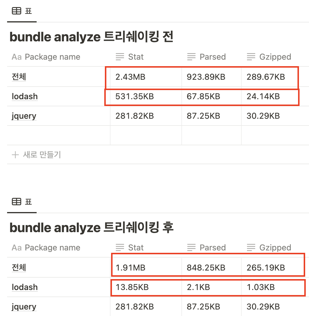 해당 lodash 라이브러리 기준으로는 Stat Size는 97.4% 감소, Parsed Size는 96.9% 감소하였기 때문에 번들사이즈를 대폭 줄인 최적화가 이루어졌다.