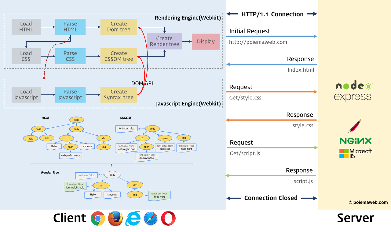 렌더링 엔진이 HTML 문서를 Parsing하고, 내부에서 DOM(Document Object Model) 노드로 변환한다. 그 다음 CSS 파일과 스타일 요소를 함께 Parsing, Render Tree를 생성한다. Render Tree 생성 후에 각 노드가 화면에 표시되도록 배치를 시작하고, UI backend layer를 이용하여 배치된 노드들이 그려지게 된다.
