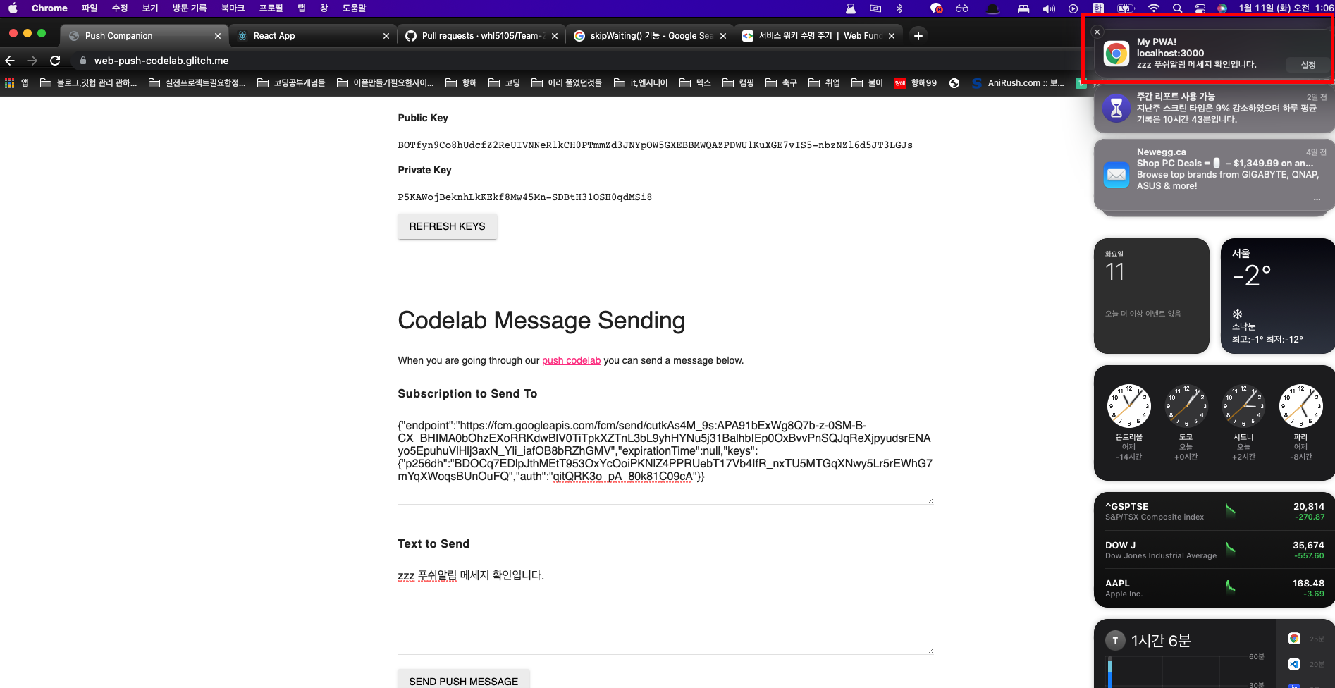 이제 web-push-codelab.glich.me 를 접속하여 설정한 서비스워커 이벤트가 잘 발생하는지 확인한다. 이때 오른쪽 상단처럼 내가 지정한 타이틀과 내용이 나온다 (아이콘설정은 아직 안했다)